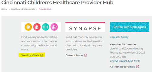 The Provider Hub is continually updated. Most recently, the “Weekly Vitals” section has been reorganized to include the latest resources on administering Beyfortus and COVID-19, as well as helpful FAQs for your patients and families.